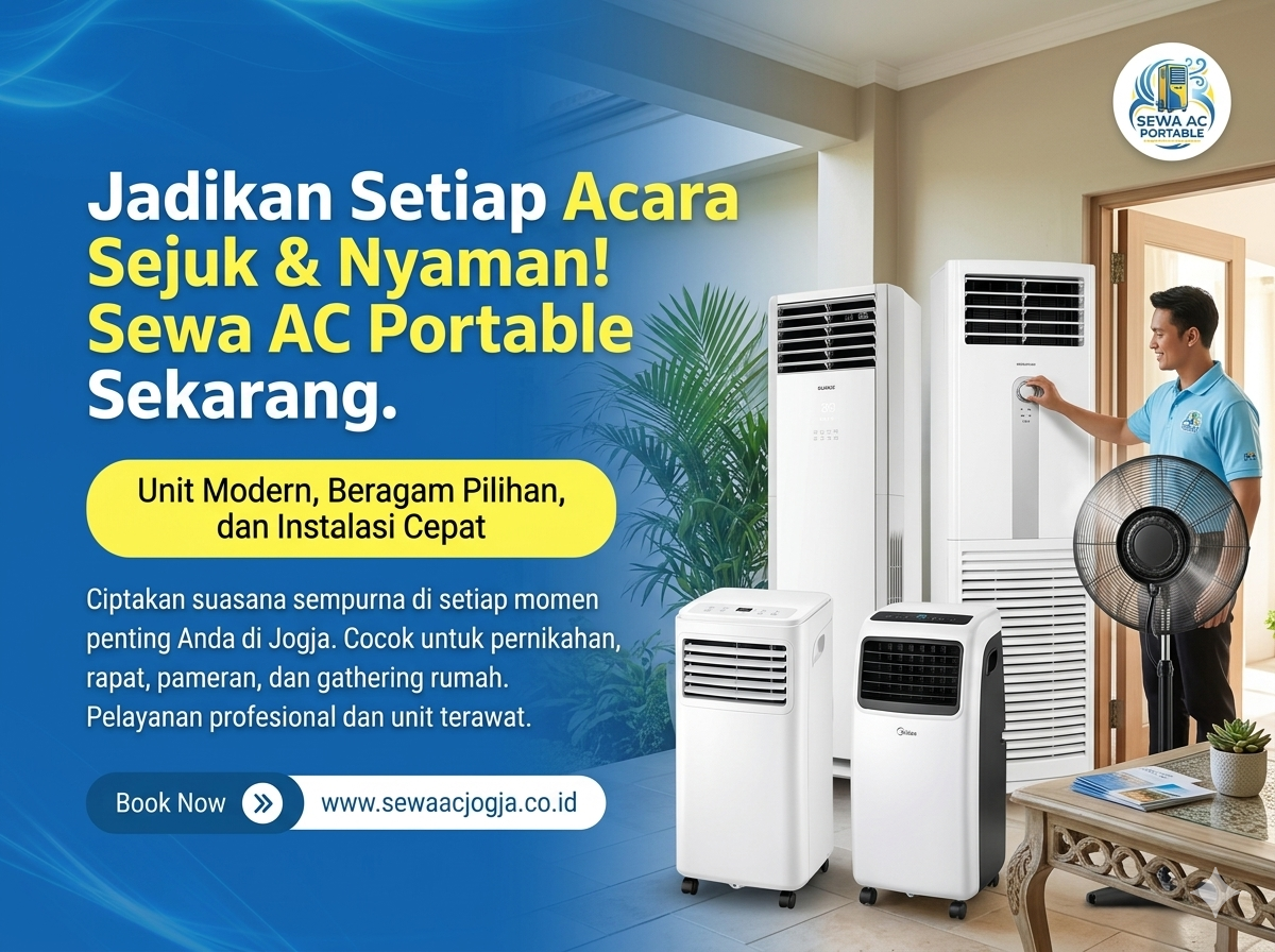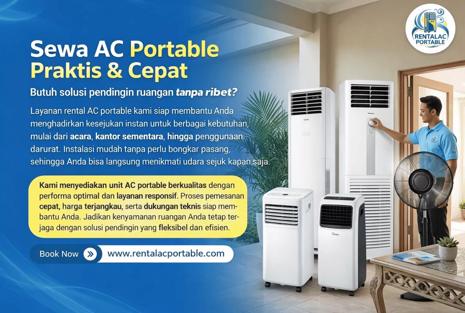 Butuh solusi pendingin ruangan tanpa ribet? Layanan rental AC portable kami siap membantu Anda menghadirkan kesejukan instan untuk berbagai kebutuhan, mulai dari acara, kantor sementara, hingga penggunaan darurat. Instalasi mudah tanpa perlu bongkar pasang, sehingga Anda bisa langsung menikmati udara sejuk kapan saja.